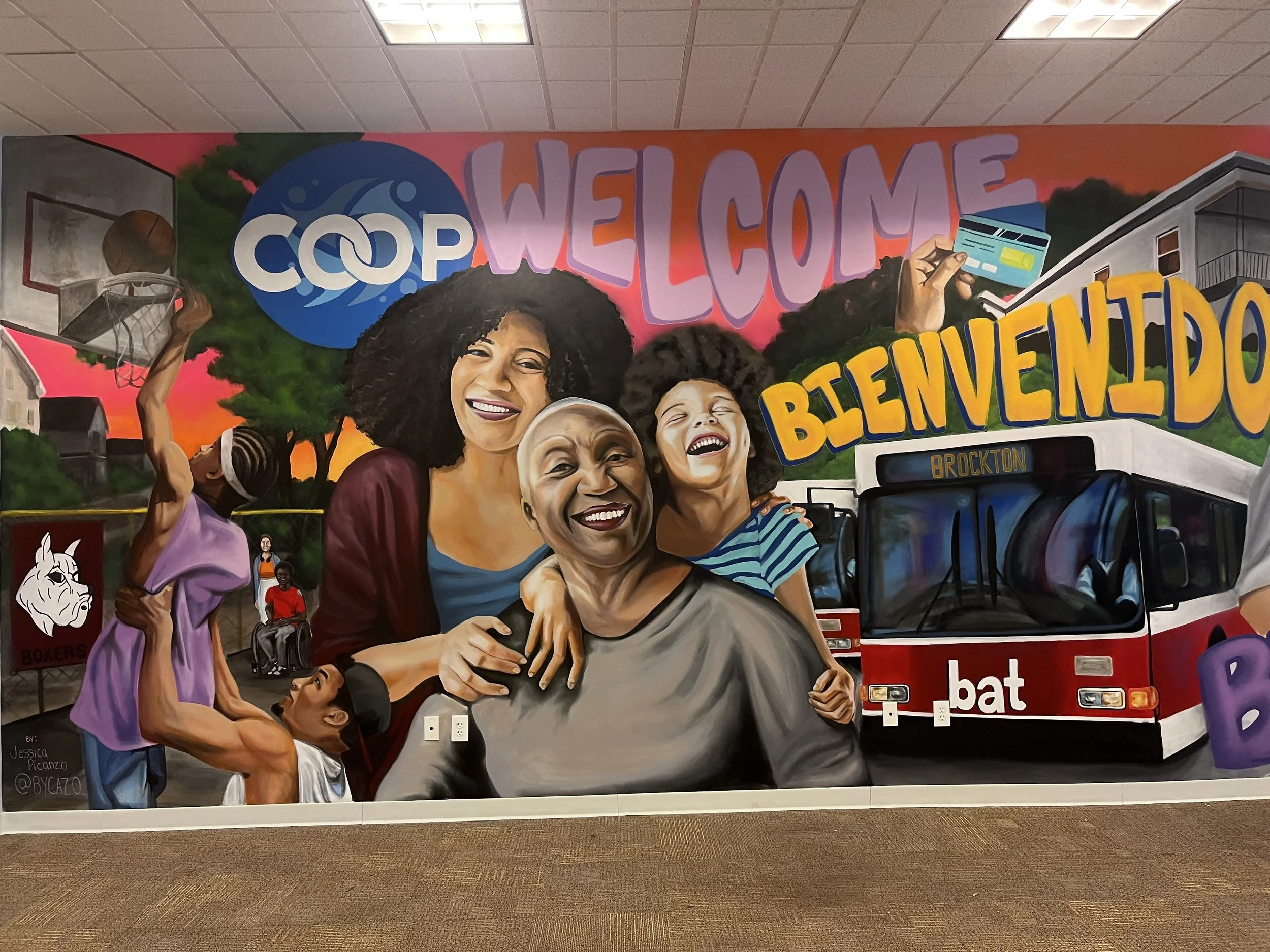 This mural was created for the Rockland Federal Credit Union, Brockton MA location, highlighting the Brockton community and recognizable aspects of the city. This large image is the left most part of the wall, it continues to the right a bit. Photos below show the full wall in segments