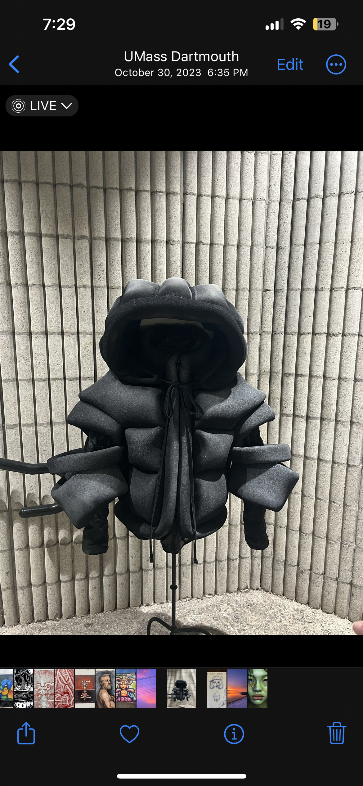 The Foam Puffer Jacket was created in my wearable art class at Umass Dartmouth. Using a thrifted jacket as the base, I glued on cut pieces of a foam roll to create this design, leaving holes in the arms for movement as well as a functional zipper and two pockets. The hood exists as its own element that can be removed. The oversized coat was finished with a layer of black spray paint and a dusting of white to emphasize the pattern of the foam.